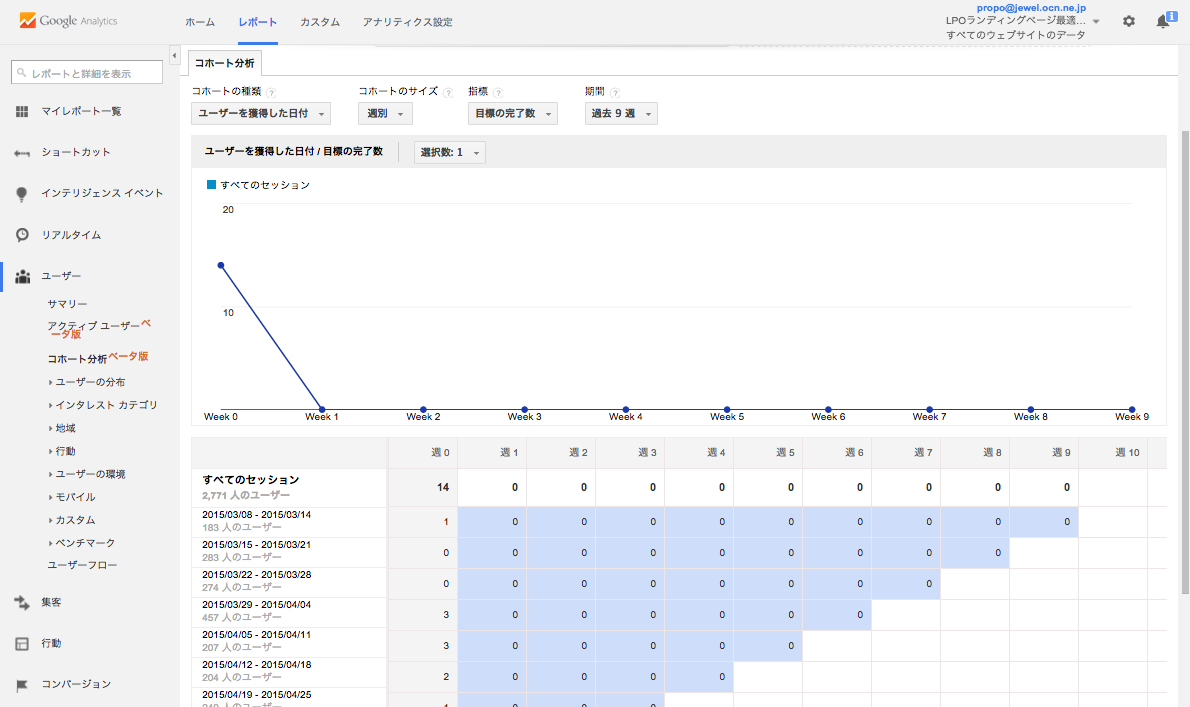 Google Analytics左メニュー「ユーザー」>「コホート分析」をクリックするとこの画面が表示されます。