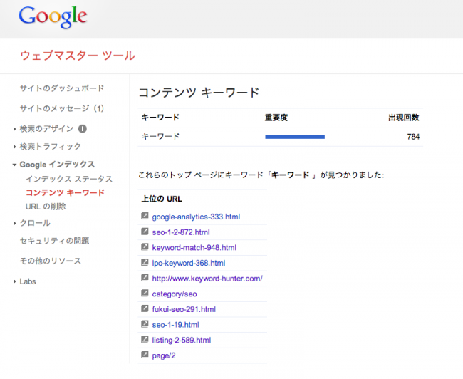 このような画面になります。この「コンテンツキーワード」というデータからは「Googleが登録したホームページをどのように見ているのか?」を読み取る事ができます。