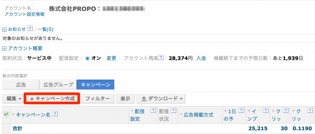 次に「+キャンペーン作成」をクリックし、インフィード広告専用のキャンペーンを作りましょう。