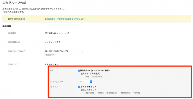 どうしてもdocomoユーザーだけに配信したい!のように、ターゲットの絞り込みが必要な場合以外はデフォルト状態で何も設定を変えずに次に進みましょう。